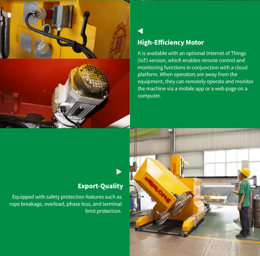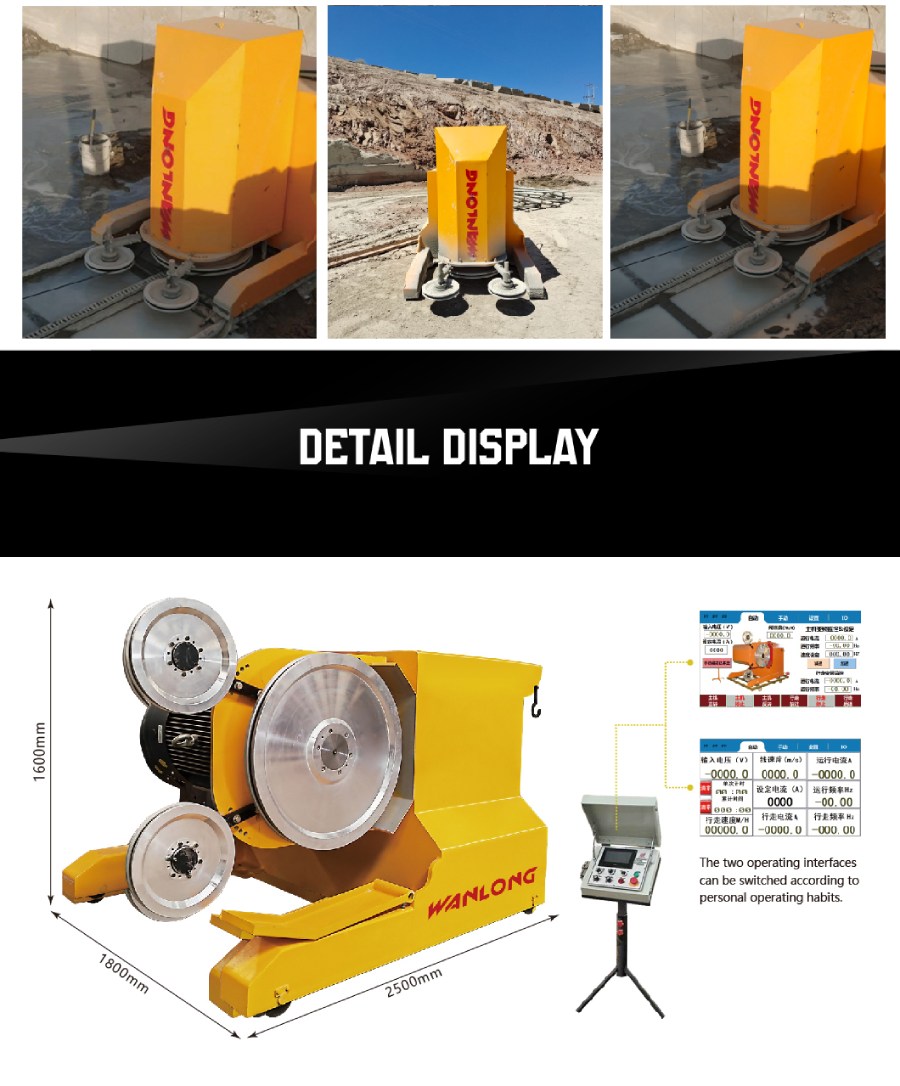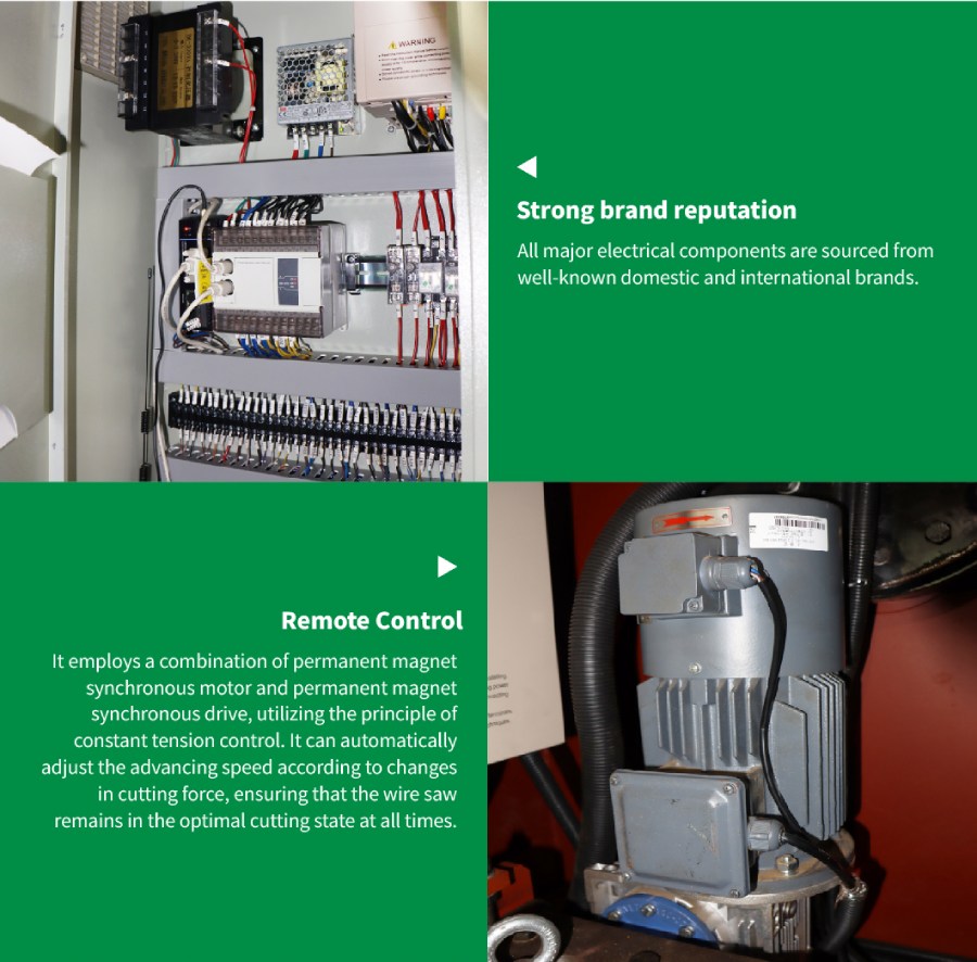 Technical features: The machine adopts the combination of Permanent Magnetic Synchronous Motor and Permanent Magnetic Synchronous drive, and applies the principle of constant tension control. It can automatically adjust the Traveling speed according to the change of the cutting force, so that the wire saw can be always in the best cutting state. It’s easy for wire saw to start cutting at low speed and constant torque, labor-saving and safe; large torque, compared with ordinary asynchronous motors, its energy consumption reduces 30% more, and cutting efficiency improve 50% more.