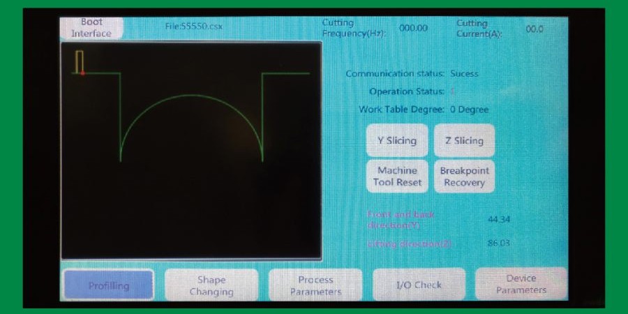 تعتمد الآلة على وحدة تحكم قابلة للبرمجة PLC وواجهة تحكم بين الإنسان والآلة. يتم التحكم في التغذية من اليسار واليمين بواسطة محول تردد خاص بالحجر، ويتم التحكم في التقطيع بواسطة محرك سيرفو لتحقيق السحب والتقطيع السريع.
